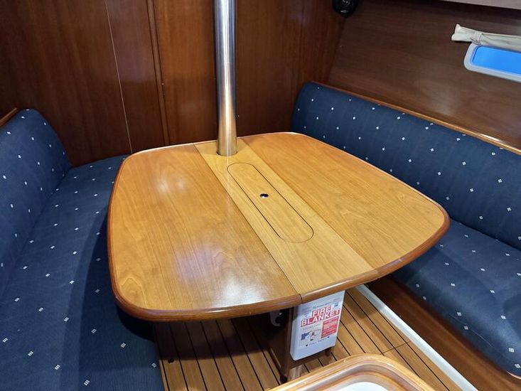 Sleeps 6 in two private double cabins plus two singles converting from saloon settees. Cherry wood interior finish throughout with blue fabric upholstery.