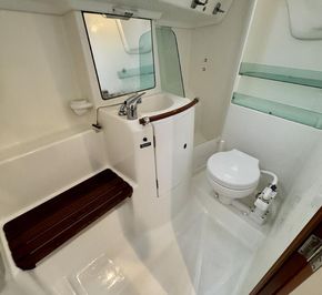 Heads: Jabsco marine WC (2023, outlet valve replaced 2024), hand basin with new shower head and tap (hot and cold), electric drain pump combined with electric bilge pump, Blakes sea cocks (inlet serviced 2024, outlet replaced 2022), Vetus EMP133 overboard pump (serviced 2026), holding tank (cleaned 2026), waste diverter valve (replaced 2025).