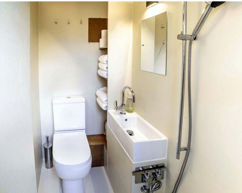 Seamless resin/paint finished ply lining, wet room floor drain to pump, wall mounted thermostatic shower, conventional wc with close coupled cistern to macerator pump, counter mounted basin with mixer tap, wall mounted, shelves, electric towel rail, extract fan, access to fuel tank behind lining