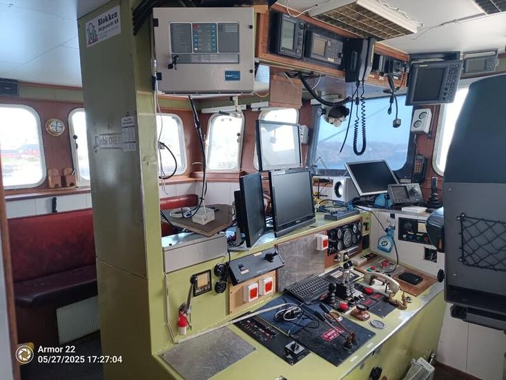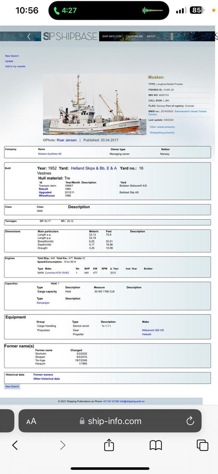 Built in 1952, upgraded through several stages. New engine and gear in 2012. Equipped with shelter deck in aluminium. Engine Cummins KTA 19 M3. 640 bhp, gear Mekanord 350 HS. Propeller Helseth. Pilothouse made in aluminium.