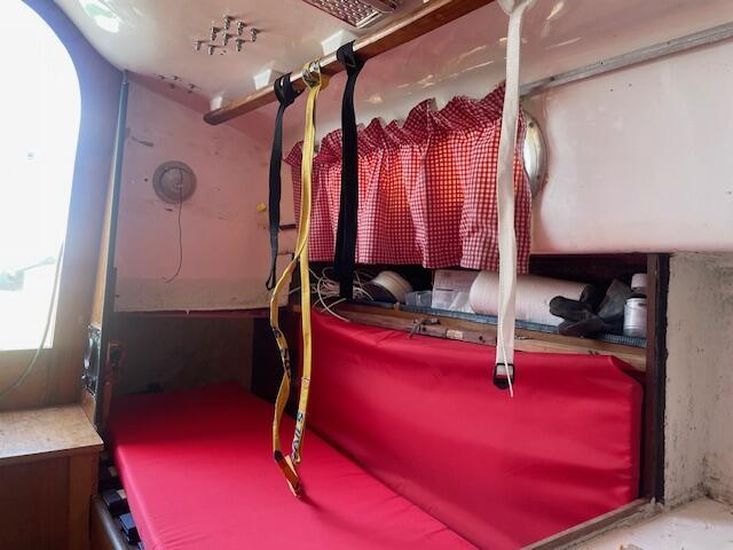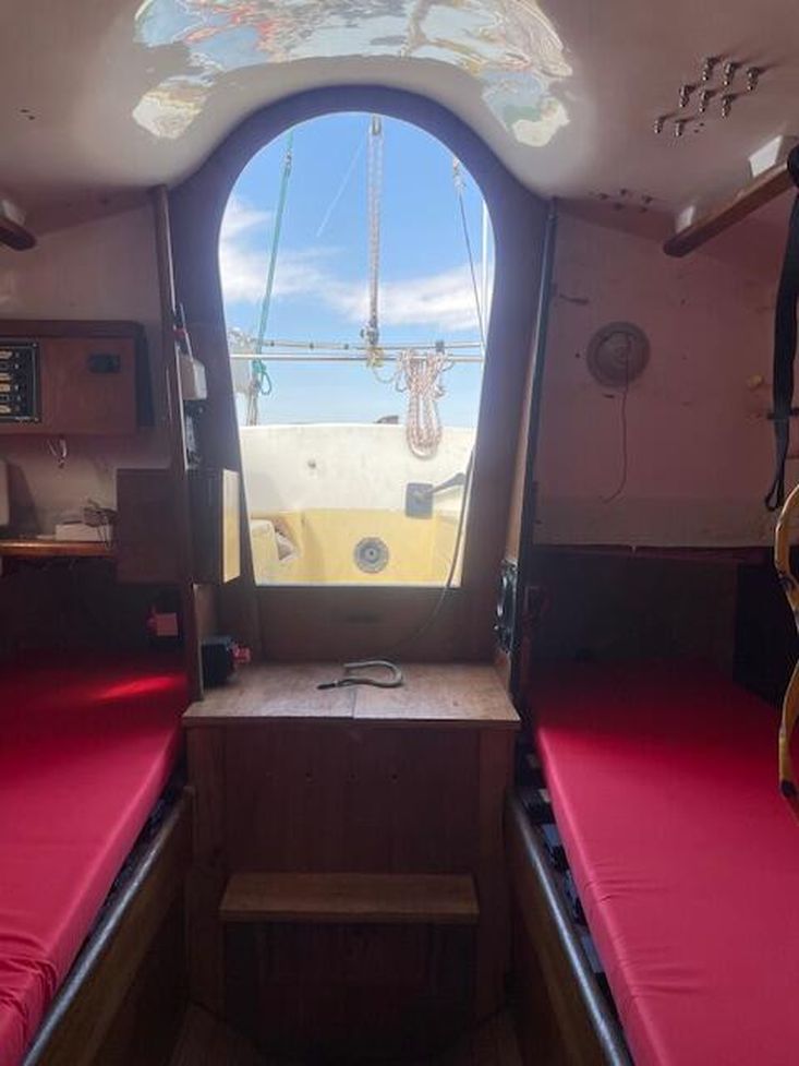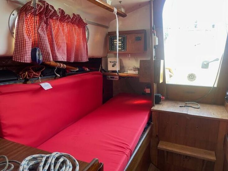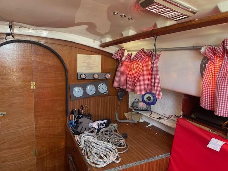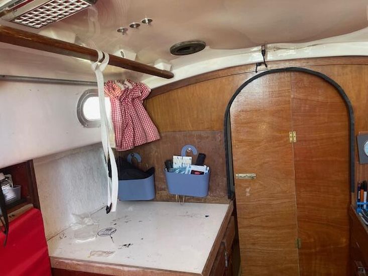 The Contessa 26 provides accommodation for four people across two cabins. The forward cabin features a double V-berth with an infill and under-berth storage. Moving aft, you'll find the heads compartment situated between the forward cabin and the main saloon. It includes a marine sea toilet [new] to starboard with storage behind. Opposite the heads compartment to port is a hanging storage locker.
