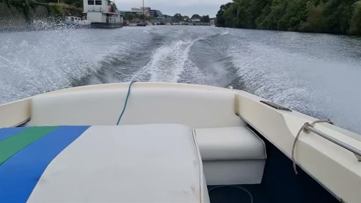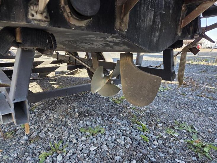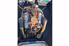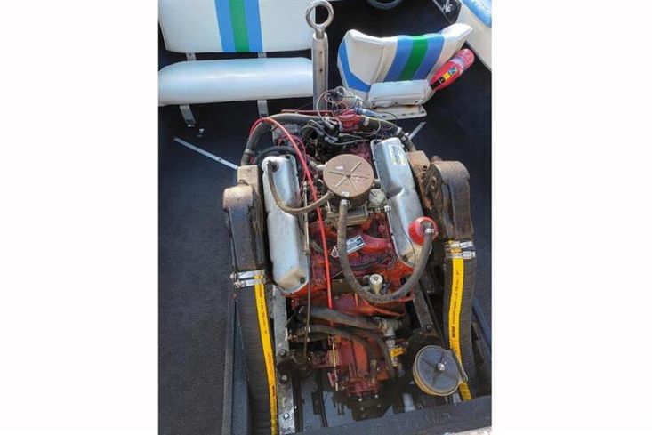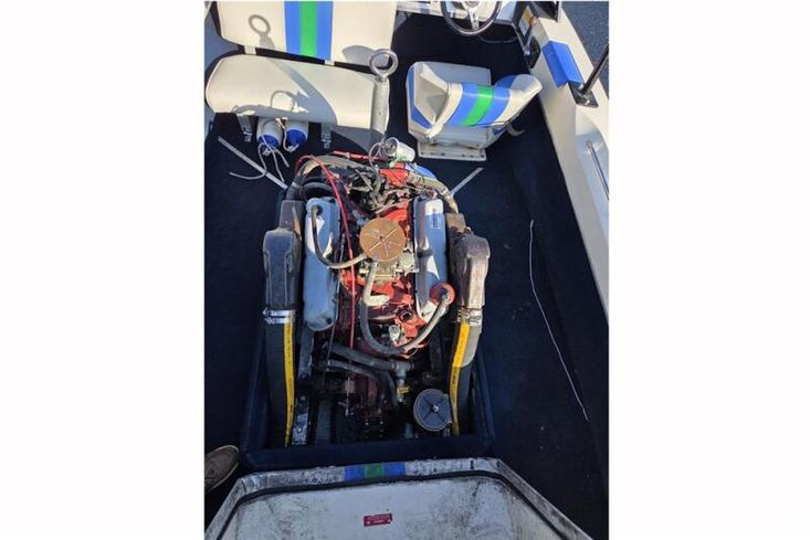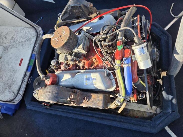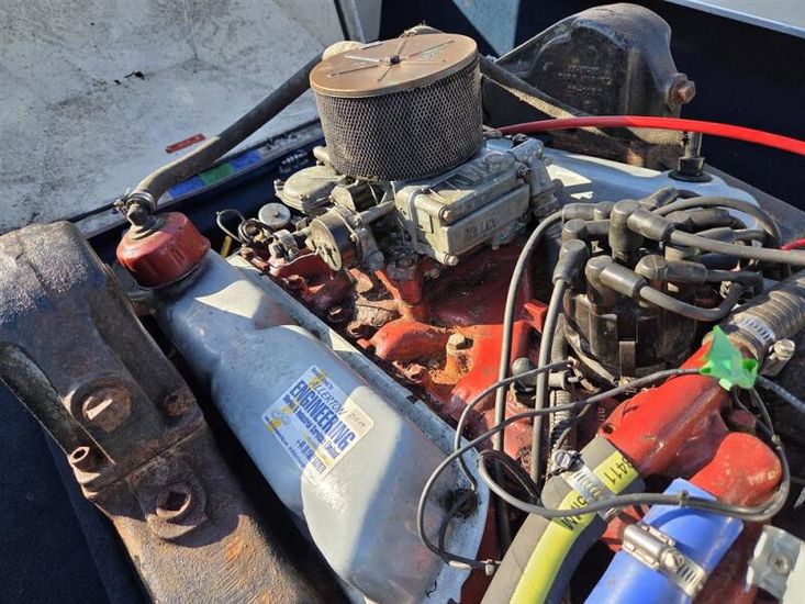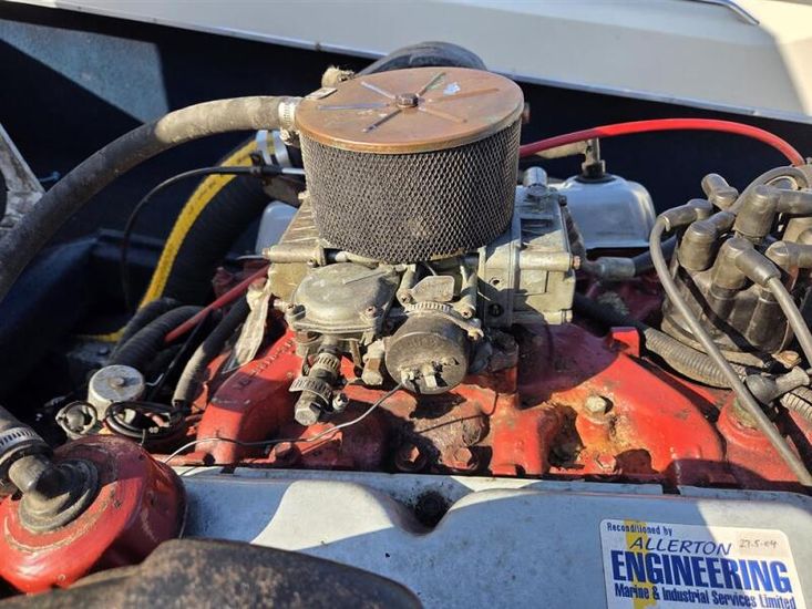 Single Ford V8, 5.8 litre petrol inboard engine mounted in centre of cockpit. Believed to be 240hp. Shaft drive via P-bracket to three blade bronze propeller. Electric start. Holley carburettor. New starting coil in 2025. Water pump rebuilt 2024. Single 12v battery charging from engine alternator.