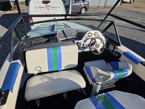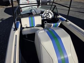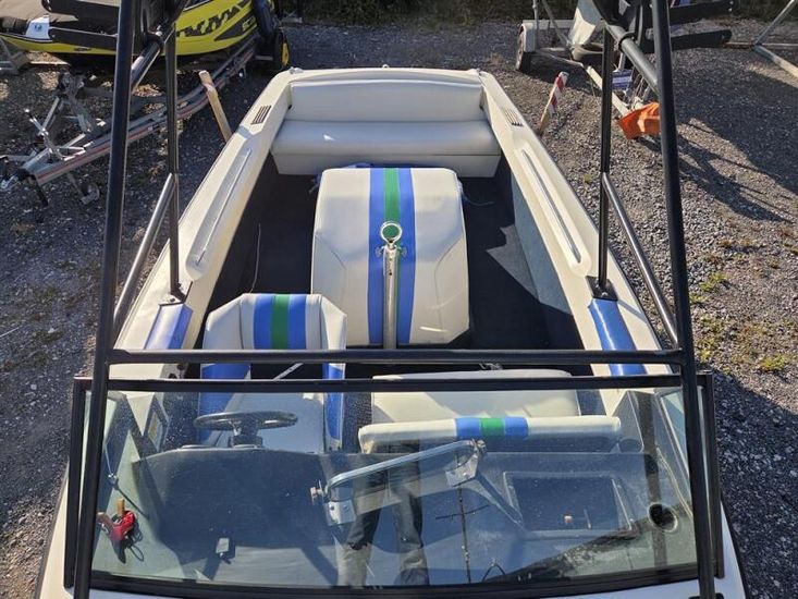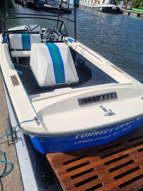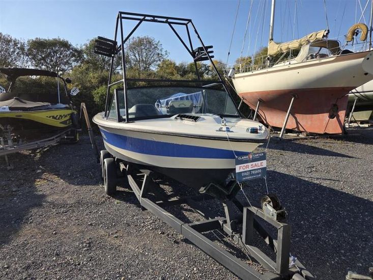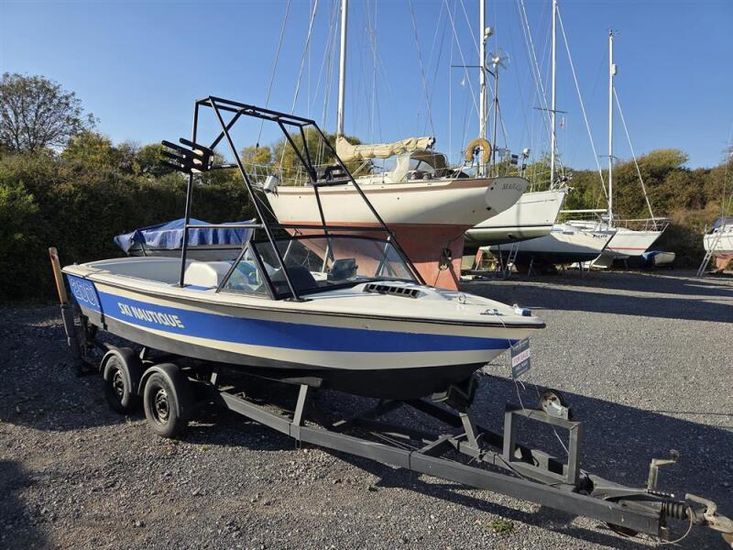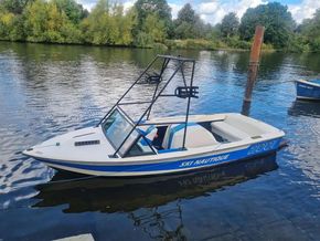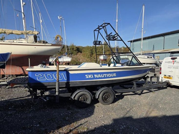 Ski Nautique 2001 built by Correct Craft in 1985. White and blue GRP hull and decks. Wheel steering with helm seat. Aft facing co-pilot seat. Rear seat. Windscreen with large rear-view mirror. Wooden bathing platform. Wake boarding/ski tower.