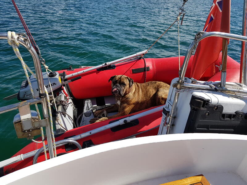 The gantry is rigged for hawling up and storing a dingy with outboard and works really well together with the transom platform. My last dingy was a Yamaha 275 with a Yamaha 6hp 4 stroke outboard, we had a big dog so used to hawl up the dingy with him in it when we had him with us and were alighting from the dingy (see pics).
