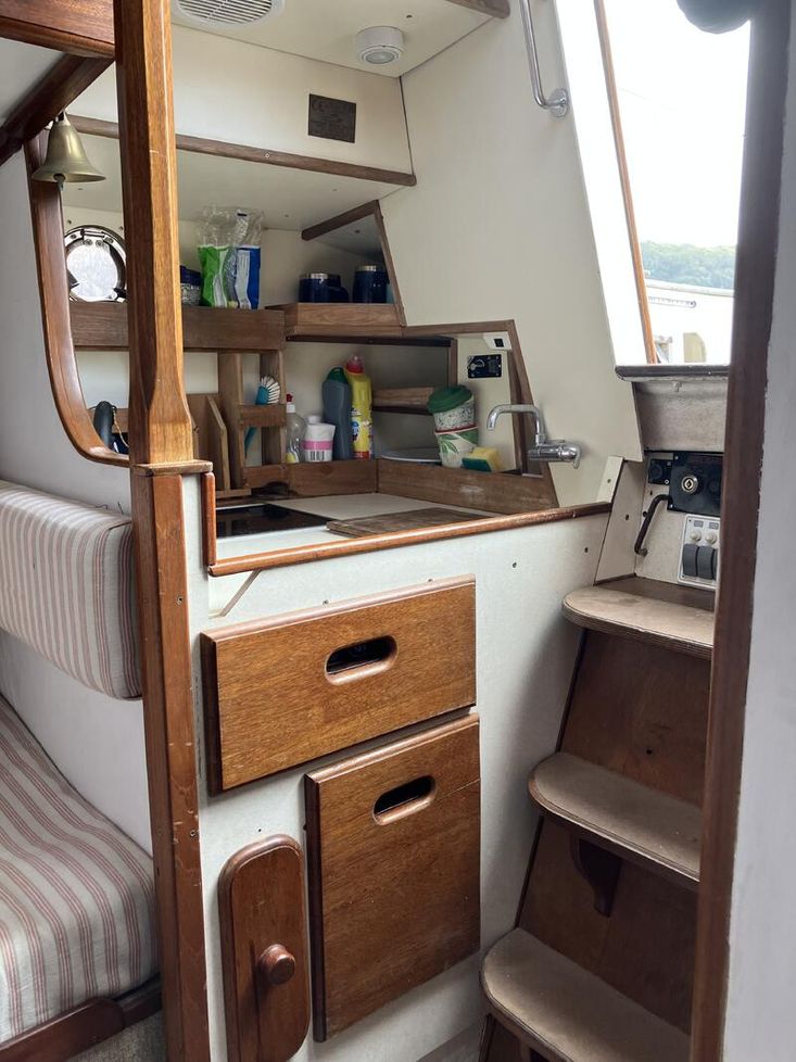 Galley to starboard with Wallas ceramic diesel hob/heater, stainless steel sink with mixer tap (Calorifier fitted but not plumbed in) and pressurised water.