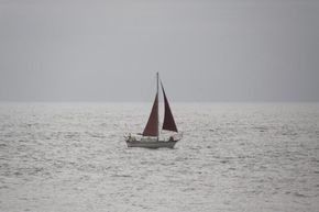 Canoe stern with traditional long keel, stubby bowsprit, hank-on foresails.
