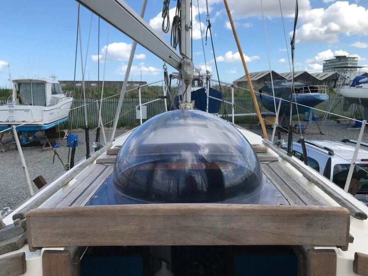 True Glory has some distinctive features : for example, deck fittings such as cleats are of larger than standard size. Principal standing rigging is upgraded to 6 mm. A stubby bowsprit is incorporated to accommodate the forestay and inner forestay of the cutter rig. All six portlights are round and opening. Uniquely, the main hatch incorporates an astrodome.