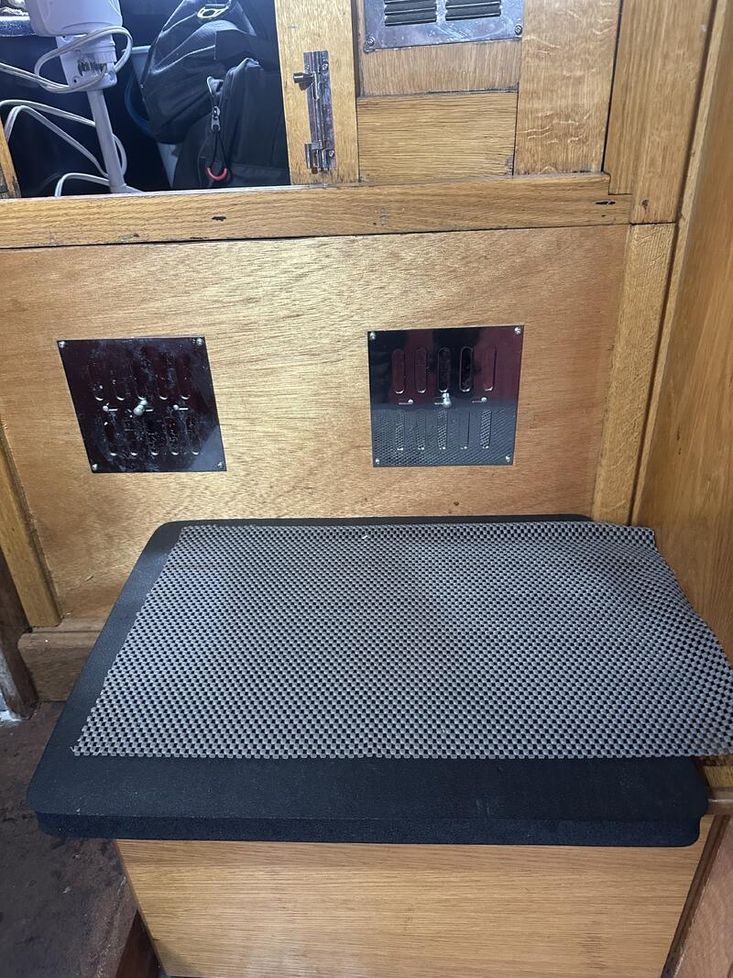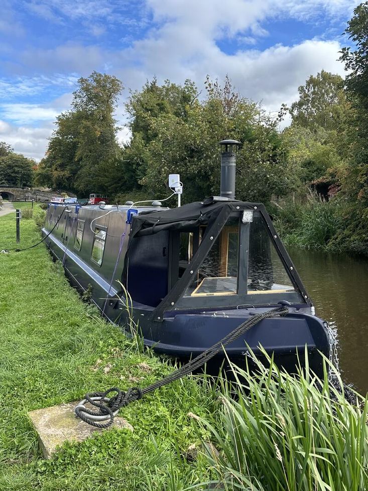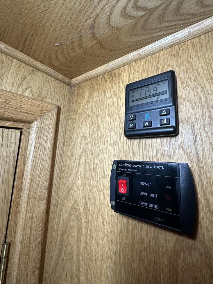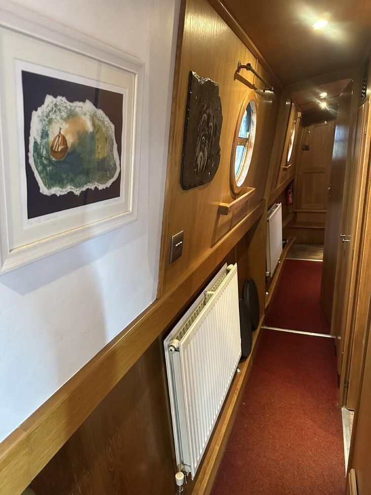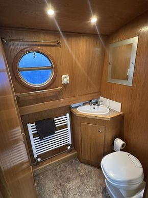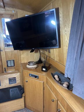 Fisher King has 12 volt direct current installation, 230 volt alternating current installation, Sterling Power Products Battery Charging System, two liquified petroleum gas installation, diesel fuelled water heater, red Chilli Penguin Hungry multi fuel stove, cassette toilet and solar power (2 x Sunpower 12 v 110w Monocrystalline Semi Flexible Panels), Victron battery combiner and SmartSolar MPPT 100/30), 5G aerial, wireless router and TV aerial. The boat has two TV’s: one LG 32” 240v (blaupunkt swivel,wall mounted in the lounge area) and a 12v one for use in any room when cruising. The cassette toilet, which is 12v electric flush, has two cassettes and is accessible from the hall.