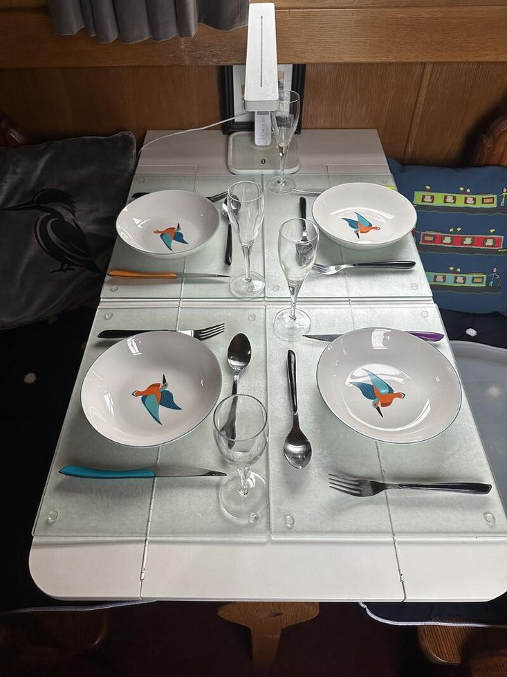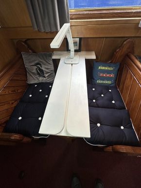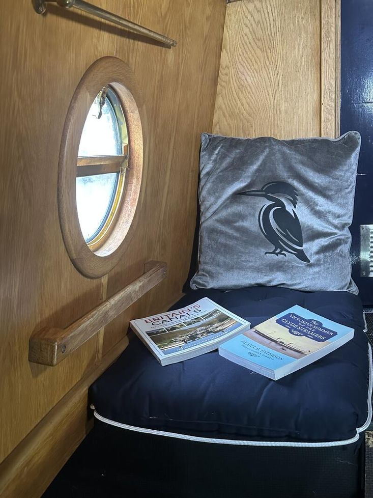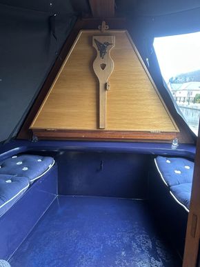Seating for up to 4 at Welldeck area. A new high quality Cratch Board, Cratch folding table and internal V shaped folding table, designed and manufactured by canal famous Mike Jordan, Woodworker. The Cratch was made using Iroko and 6.4mm laminated safety glass. Costs, excluding installation, but including the tailor made covers by Forth Marine Textiles (front and back) was £2,050. A brand new set of Marine (royal blue and white piping) cushions are available for use. Front lockers house extra ballast, mooring hooks, hammers, mooring ropes, spare coal and BBQ equipment. Under the front hatch are two gas bottles.