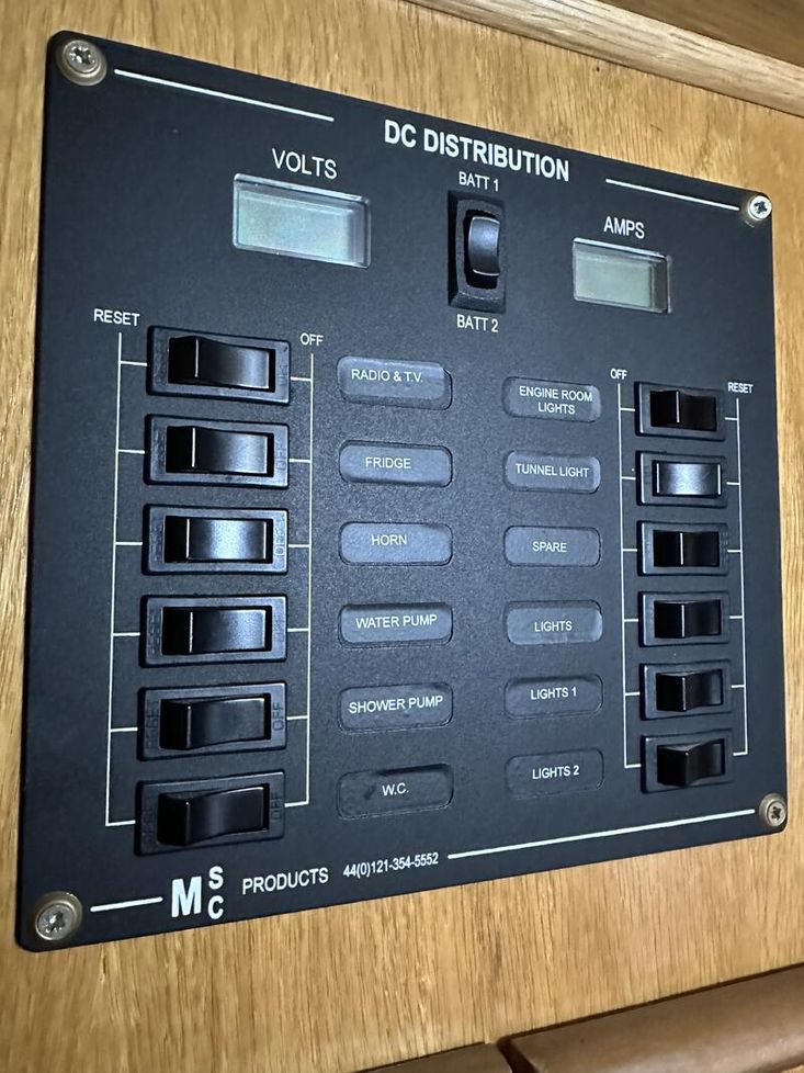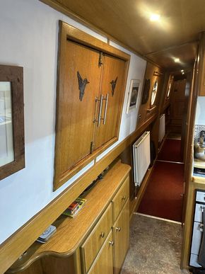 Connecting “hall” wall storage cupboard for clothes and shoes. The wall has a 12/24 Volt 150 Amp DC Panel. This panel controls Batteries, Lighting, Fridge, TV/Radio, WC, Tunnel Light, Bilge Pump, Water Pump and Shower Pump - all can be isolated. The DC Distribution Panel also allows the user to look at two meters displaying the state of charge in the batteries. Further central heating radiator in this area.