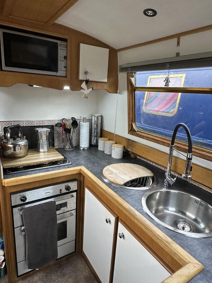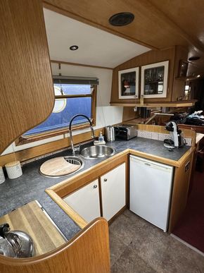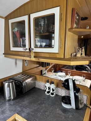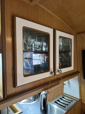 Galley - U shaped galley to port (7” overall length), Grey Formica worktops and traditional tiles. Amtico flooring and new stainless steel mixer tap. New hoses and braided pipes for the twin sinks. Shoreline fridge, with small ice freezer. Stainless steel Thetford oven/grill/storage drawer and four-burner hob were installed in 2020 as new - to replace the original fixtures - by a Gas Safe Engineer who certified them through a Gas Safety Record. New water filter fitted and not yet used, along with new water pump, on 6 August 2025. Both are found under the kitchen sink. SHARP Microwave R-247 800W (IEC 60705) oven in overhead shelf 240v. Base units accommodate fridge/oven. Kitchen overhead cupboard and microwave shelf. Double hatch to starboard side with Kingfisher steel motifs. An eye-level glass display cabinet sits between the kitchen and lounge.