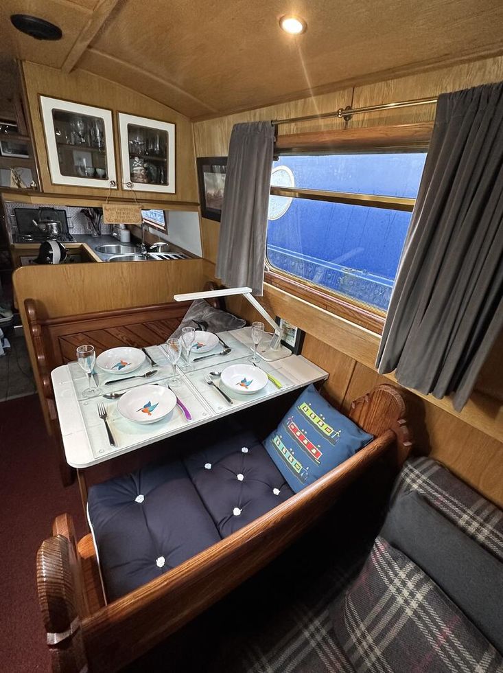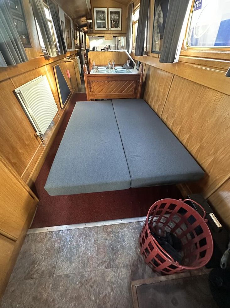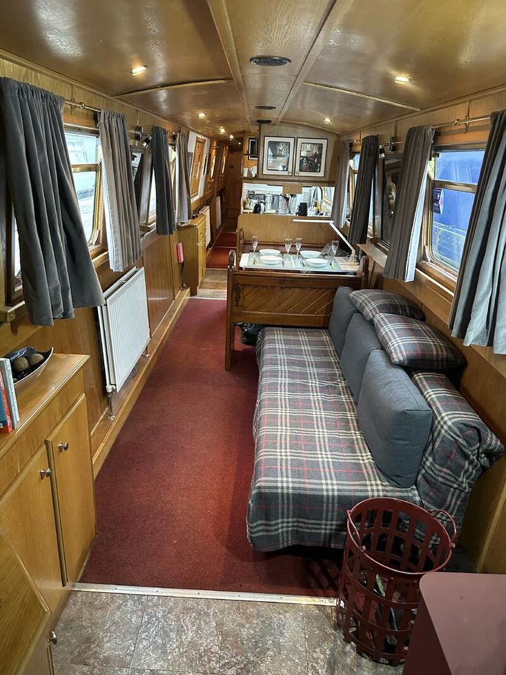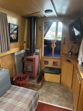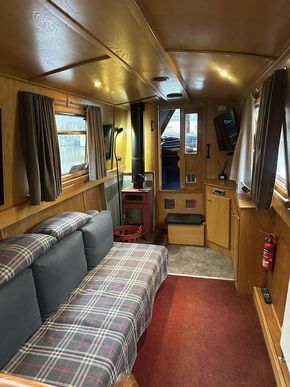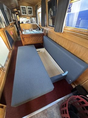 Lounge - Fwd. Two church pews sit either side of a folding and removable “T” custom table. The table was designed and manufactured by Mike Jordan (a specialised canal boat woodworker), in spring 2020. Pews were bought to be used as four seats and to double as a child’s cot or infant’s bed space. (Pews are the subject of separate negotiation, due to sentimental value). Red carpet and Amtico floor tiles. Low level shelves and cupboards to starboard side. Central heating radiators and red Chilli Hungry Penguin multi-fuel stove with top oven. A nearly new three-seater sofa bed with storage folds down easily to provide a further double bed with a removable cover made by SOFERIA (Stewart Anthracite Master), textile protection and washable. CD and radio (JVC), speakers (Pioneer), internet hub and wiring, LG (32L, rated A) TV and Blaupunkt swivel wall mount.