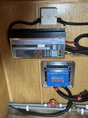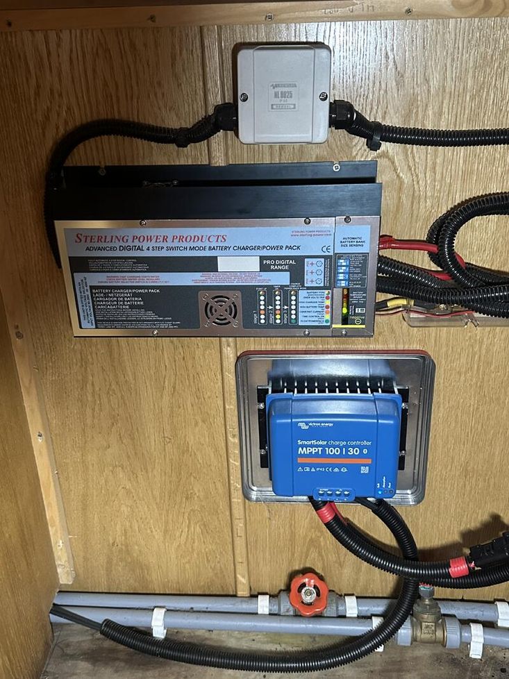 Sunstore Solar Power Solutions - 2x110w Monocrystalline semi flexible panels, Victron Cyrix-1 Battery Combiner, Victron SmartSolar MPPT 100/30 - installed on insulated roof panels. System and solar power production can be monitored on a smart phone. System was in excess of £1,600 and can be extended if required. It can power fridge, TV and lights when away from shore plug-in. The solar system and state of charge and draw can be monitored from smart phones.