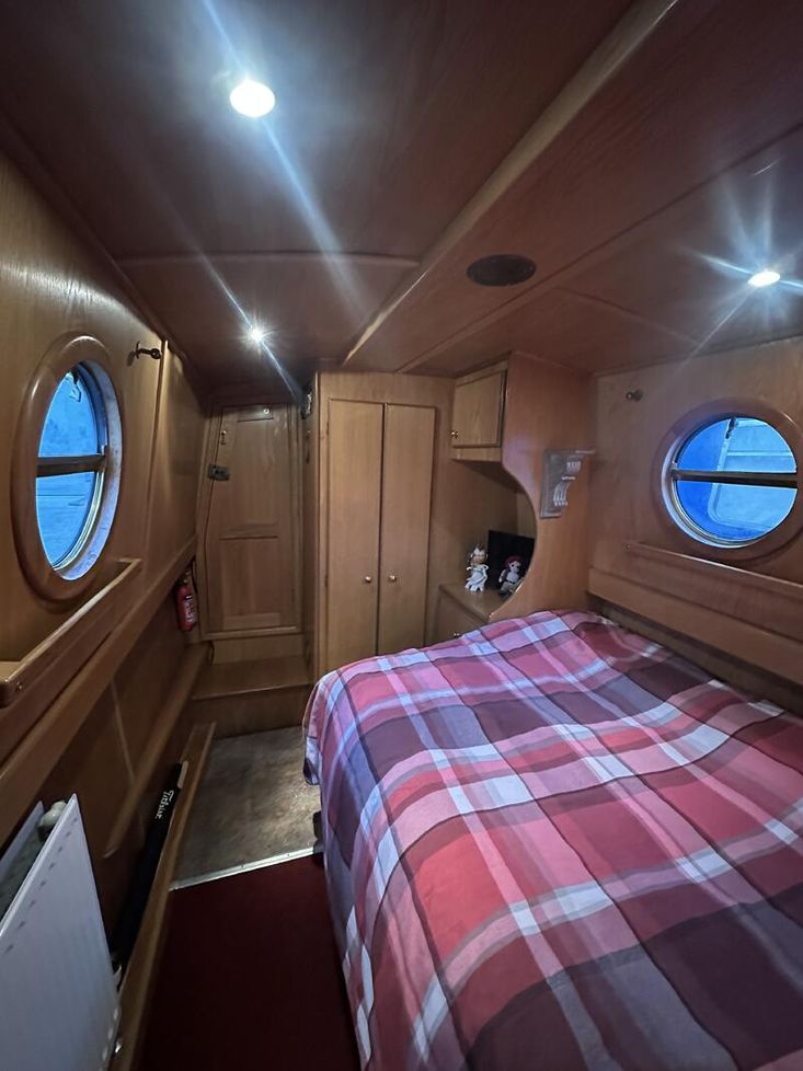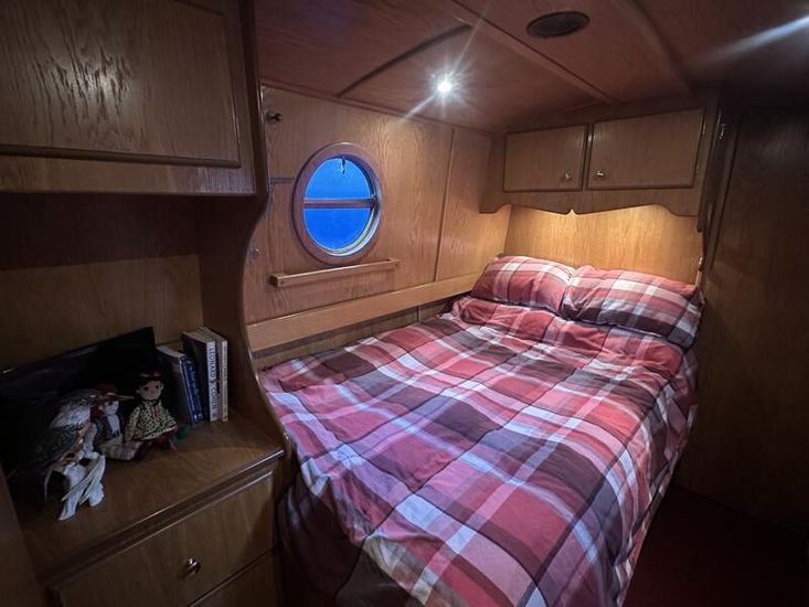 Rear Bedroom - Fixed double berth at stern, with six storage drawers under the bed. Stainless steel cabinet knobs. Cupboards over bed head with reading lights (port side). Fitted wardrobe and three-drawer dresser with shelf and cupboard overhead. The wardrobe houses the Victron SmartSolar MPPT 100/300 solar power system. Mattress for double berth. The bedroom has custom made port hole covers for insulation and blocking out light when sleeping. Brushed stainless steel sockets and light switches. Carpet and Amtico premium tiles at steps to internal engine bay. Radiators are situated throughout the boat - one in the bedroom. These are water filled and powered by diesel via an Eberspacher. Digital Timer Modulator with Diagnostic Readout is situated to the rear of the bedroom. Storage is also available under the rear step. This space houses heavy duty wire cutters, safety metal mesh gloves to clear the propeller in the event of any blockages in the weed hatch and spare grease for the stern gland.