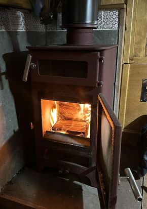Chilli Penguin Hungry (red) multi-fuel stove with Top Oven - bought from Linlithgow Stoves. The output is 4.8 KW, efficiency is 81.2% (wood) and 87% (smokeless fuel). The stove and fitments were installed to Boat Safety Scheme (BSS) standards BS 8511:2010 at a cost in excess of £3,750 excluding labour. The hearth construction is corten steel and Iroko wood surrounds. Tiles are porcelain on A1 Fire rated 12mm construction board. The stove heats the boat very well and can be used to cook small dinner and boil your kettle. This is ideal if you don’t want to use gas, solar or electricity when out on the cut.