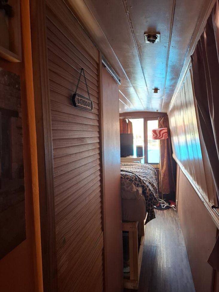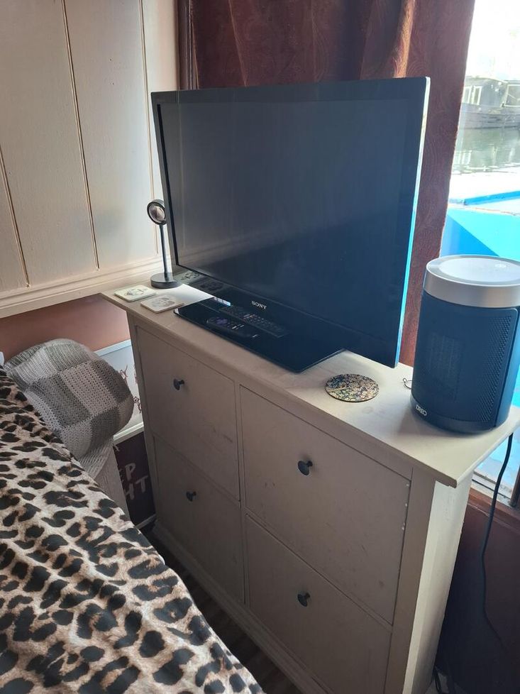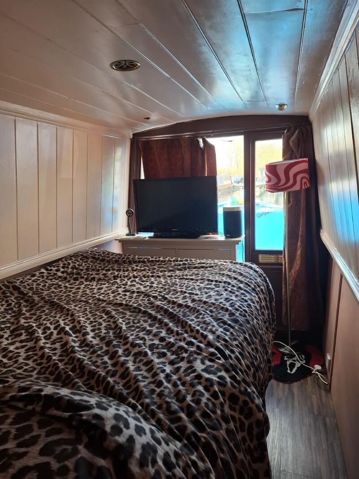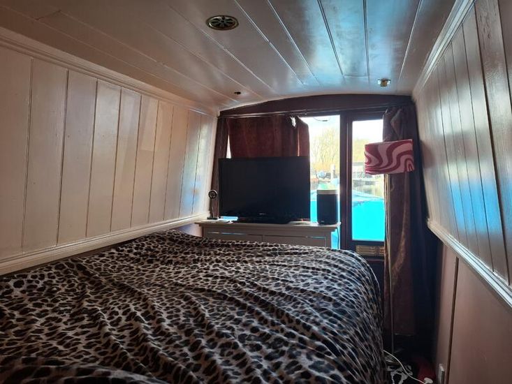 Bedroom Description: Double bed, underbed space, slim drawer unit and TV at base of the bed. Right hand door to enter the bow.