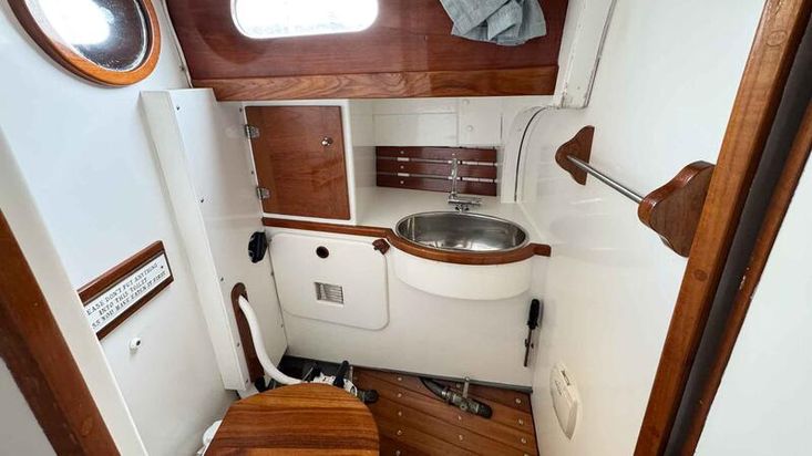 Heads: Jabsco manual sea toilet, 35L waste tank, stainless basin with hot/cold water