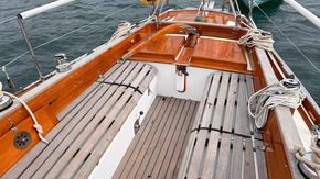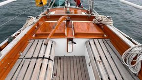 Self-draining cockpit with scrubbed teak thwarts, redesigned in rebuild