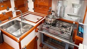 Galley: Origo 2-burner gimbaled stove with oven, twin stainless sinks, pressurised hot/cold water, Waeco 12V fridge