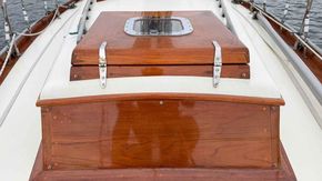 Self-draining cockpit with scrubbed teak thwarts, redesigned in rebuild