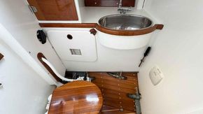 Galley: Origo 2-burner gimbaled stove with oven, twin stainless sinks, pressurised hot/cold water, Waeco 12V fridge