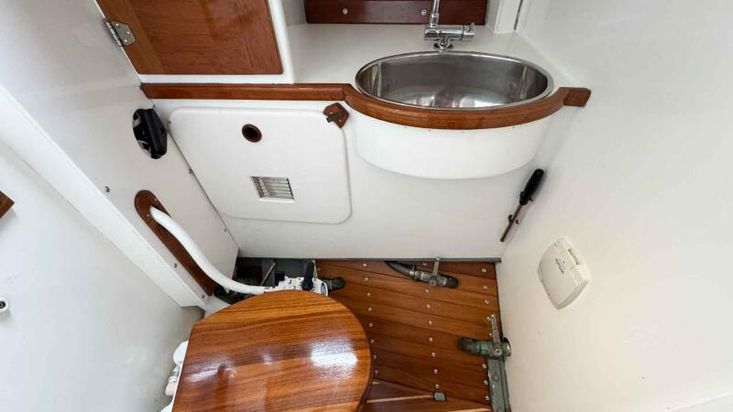 Heads: Jabsco manual sea toilet, 35L waste tank, stainless basin with hot/cold water