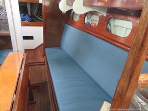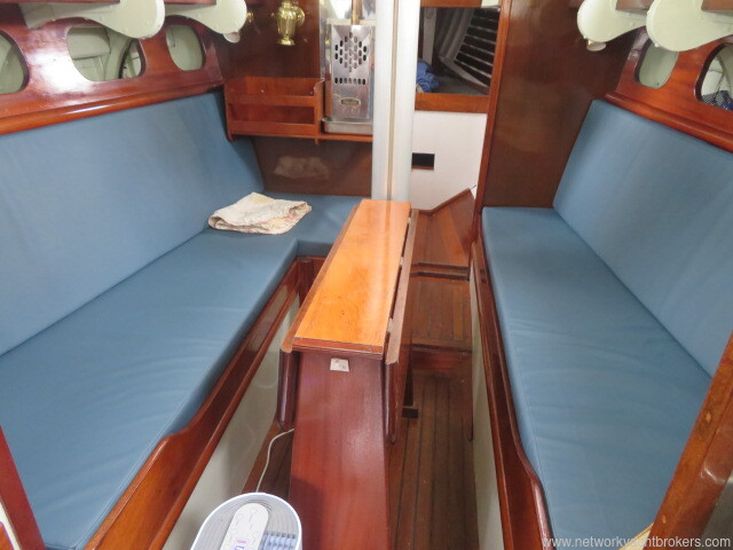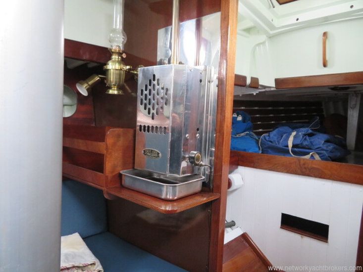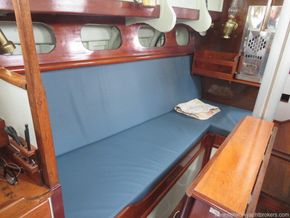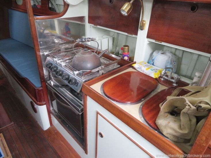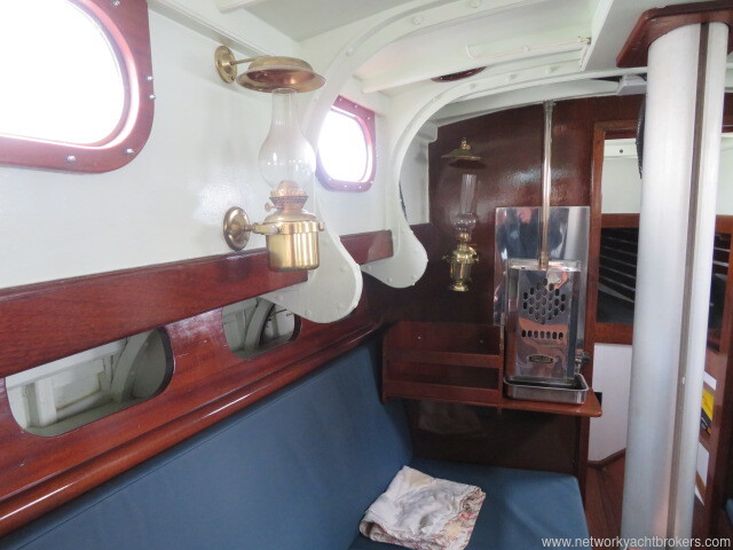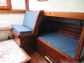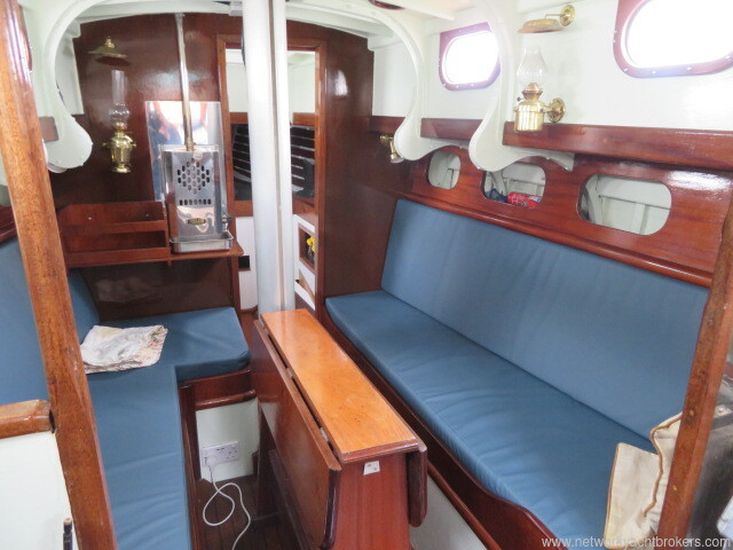 This Robert Clarke 37 offers four berths in a single cabin. Stepping down through the companionway steps over the engine box, you enter the main cabin, where port and starboard full-length quarter berths run aft. Each side of the companion way features a small pilot-house seat, providing an excellent sheltered position for the on-watch crew while remaining close to the helm.