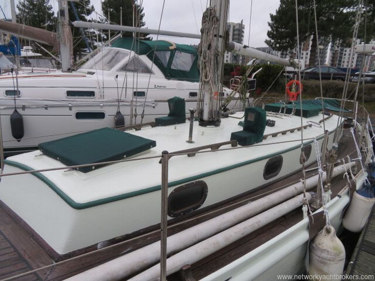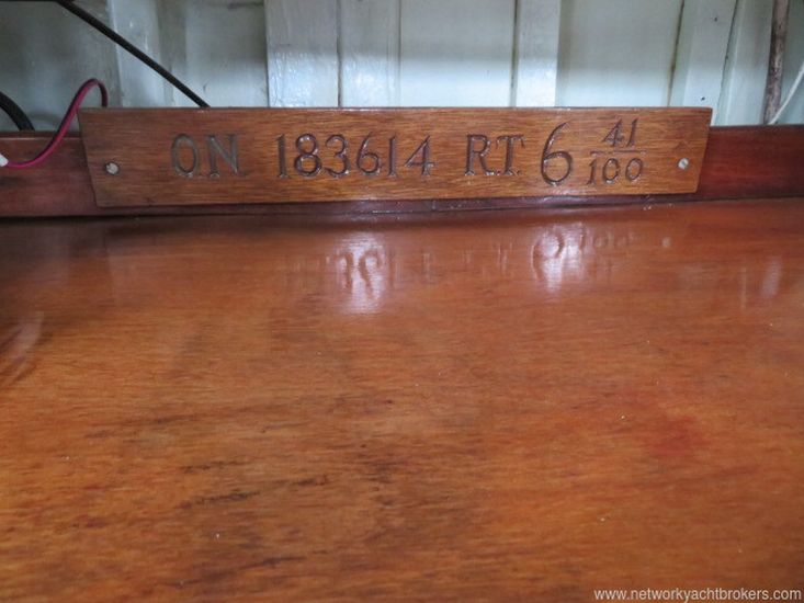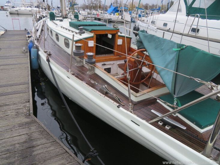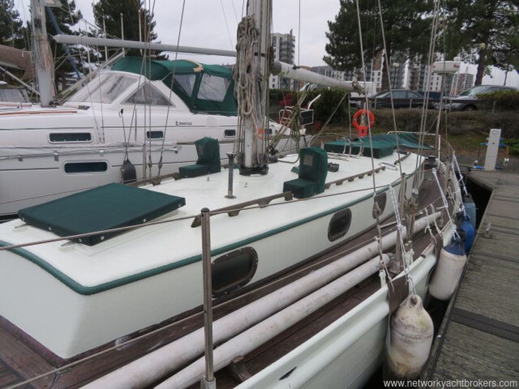 Built in 1950, this Robert Clark 37 was built by Thornycroft to Lloyds 110AI and kept in class until the mid 1970's. She is built of planked 7/8 mahogany above the waterline with teak below, fastened with copper nails and roves to steam-bent 1.5 x 1.25 inch Canadian Rock Elm timbers at 7" centyres. Larger scatling frames in the area of the mast step, all bronze screw fastened hood ends. There is a galvanised steel step floor with oak floors fitted in the way of the mast step for additional strength. It has a lead ballast keel fastened with momel or stainless steel keel bolts. Two large ring frames made of galvanised steel, made to Robert Clark's known design to add strength to the mast step area. These run up the inside of the hull under the deck and up the coachroof. The deck is teak-joggled to a king plank screw fastened over the original tongue and groove cedar deck. The hull and topsides are painted white with a teak deck. This yacht was last out of the water in January 2020. The owner is selling due to a lack of time to use it.