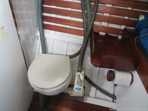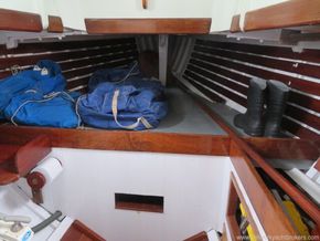 At the forward end of the saloon, a sliding starboard door leads to the forward cabin. To port is the heads, fitted with a Jabsco sea toilet discharging directly overboard, while a hanging locker for oilskins is situated to starboard. The forepeak offers a large double berth—currently used for storage—with a hatch above for ventilation. The hull sides are finished in white gloss with varnished mahogany slats. The anchor chain locker sits beneath the berth, served by a hawse pipe leading into the cabin.