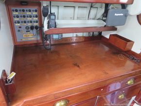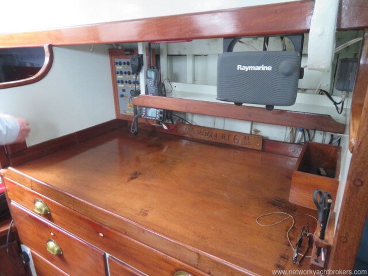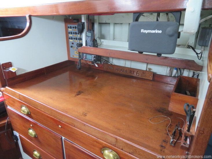 The galley is fitted with two sinks with hot and cold pressurised water to the sinks, complemented by a hand-pumped salt-water supply. Hot water is heated by the engine via heat exchanger or via the 240V shore-power immersion heater. The galley has a three-burner gimballed gas stove with oven and grill. There is a lot of storage cupboards above and below the sink and easy access to the lockers behind. To port, the chart table faces outboard and includes drawers, cupboards, and space for electronic navigation equipment.