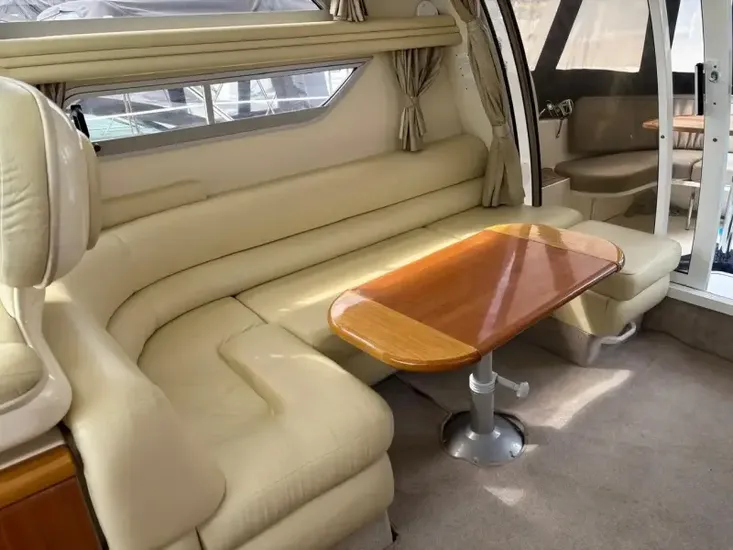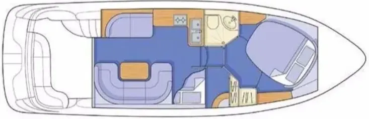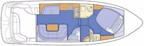 The Sealine F33 Flybridge is a classic example of brilliant flybridge motor yacht design. An extended flybridge provides deep, safe seating, a large sunbed, & stores the cockpit canopy & table. The flybridge provides excellent visibility when using the upper helm. Molded stairs provide safe access from the cockpit, which has L-shaped seating, storage lockers, & a large engine access cover. The saloon & galley allow maximum use of space, while at the same time offering versatility with a built-in hob, oven/grill, sinks, plus high & low level storage - all designed to blend with the layout of the saloon. Forward & mid cabin provide two double berths with a head/shower compartment accessible from both. By clever use of the saloon seating a third double berth is available when needed. The deck layout allows safe, easy movement when mooring, with well-positioned handrails & a full-length pulpit rail with guard wire providing additional safety.