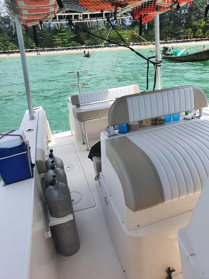The boat is licenced for 10 passengers and 2 crew. There is seating for at 12-14 people, however if used for diving the limit should be 8 divers as the equipment takes up a lot of space. There is a toilet with storage space. Lockers for storage. Canopy covering the whole length of the boat.