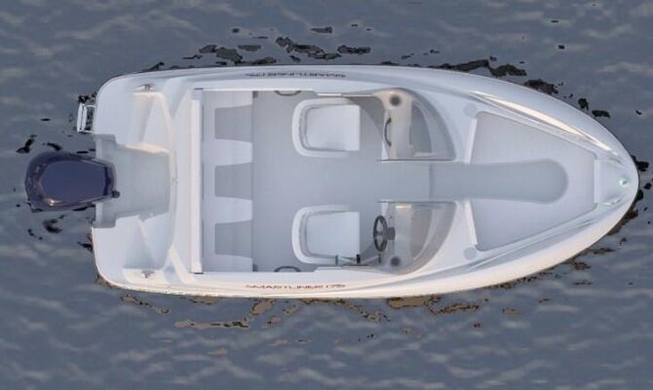 It has a full windshield protection, a spacious cockpit, allows lots of storage and is a very agile and performing boat for its size.