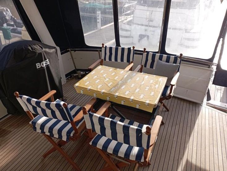 Take in panoramic views from the large dual-helm flybridge, complete with a Bimini canopy for all-weather comfort and plenty of seating for entertaining guests. The teak stern dive platform offers easy water access, flowing seamlessly onto a covered aft deck that transforms into a relaxed and social hub at sea.