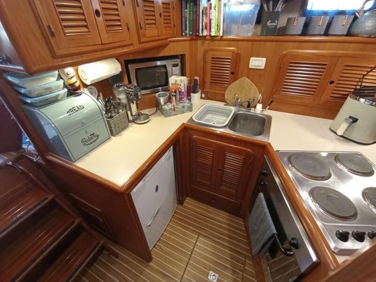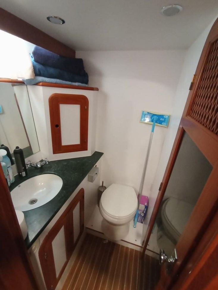 Separate shower compartment to starboard with marble surfaces with hot & cold mixer shower – new 2018. Teak floor grating.