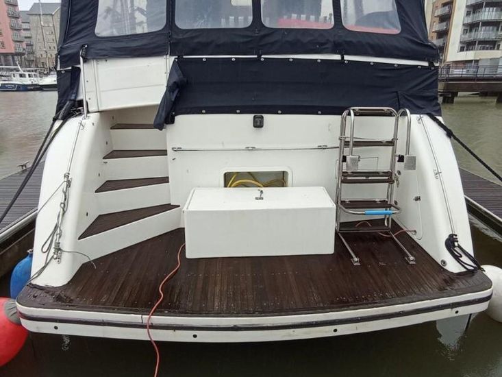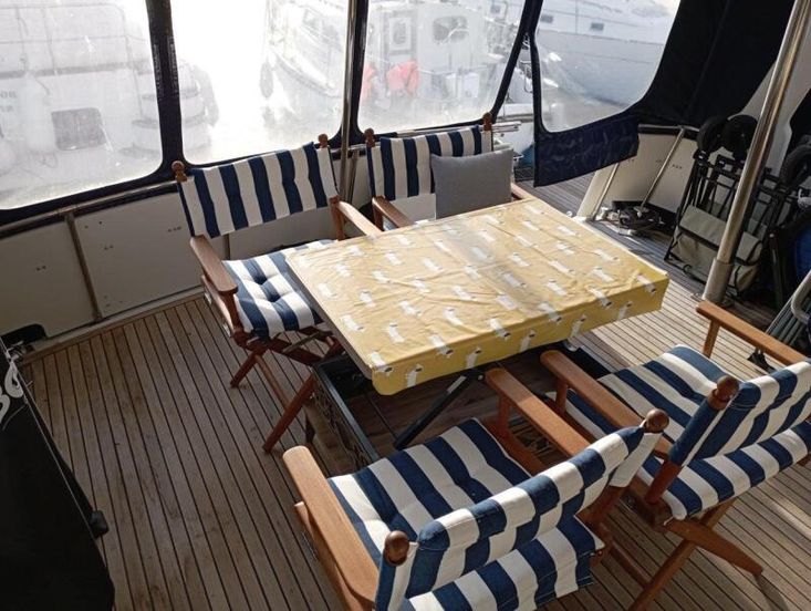 Large full beam aft deck area with GRP roof canopy and full canvas enclosure.