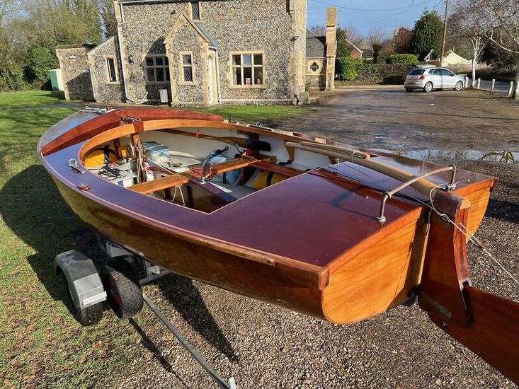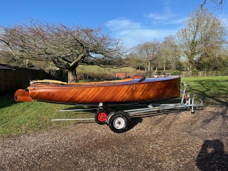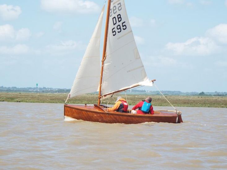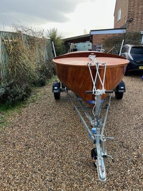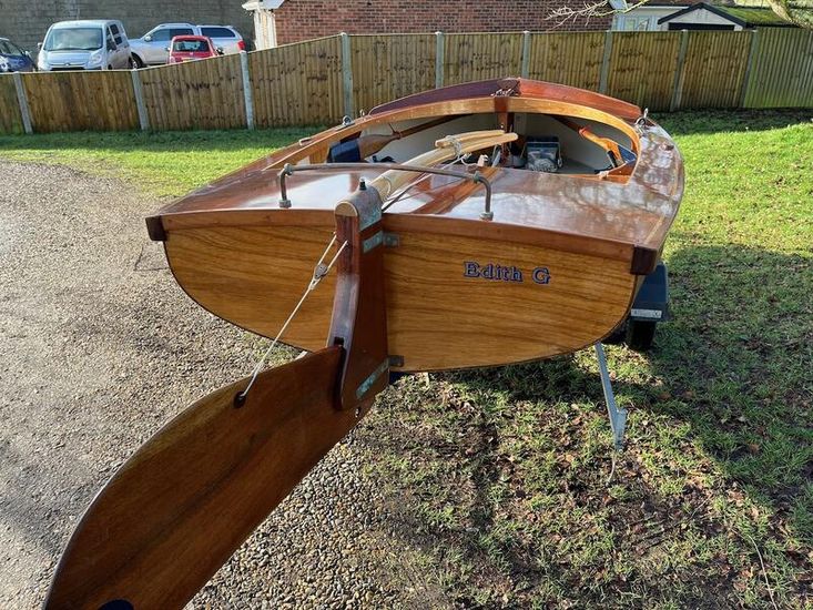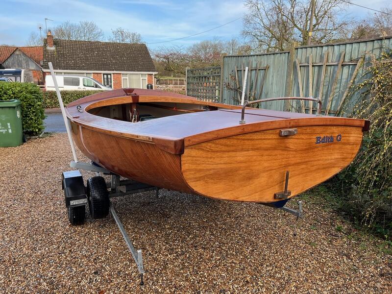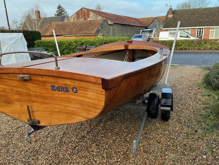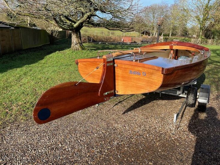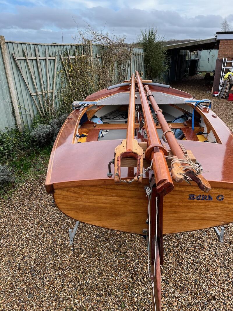 Amateur built over a long period and launched in 2018, Edith G has had relatively light use. She is a Yachting World 14’ Dayboat: a stable, seaworthy classic dinghy well suited to estuary sailing as well as river and lakes. Although a heavy boat for 14’’ she has good performance. The large beam (5’8”), hull form and steel centre plate make it an excellent and safe family dinghy. Some are kept on moorings most are kept on trailers.