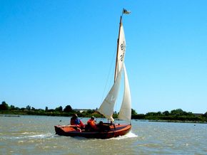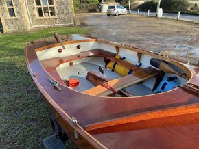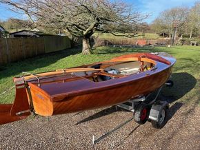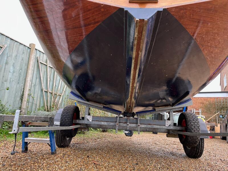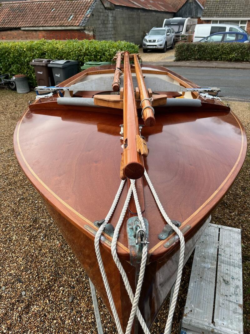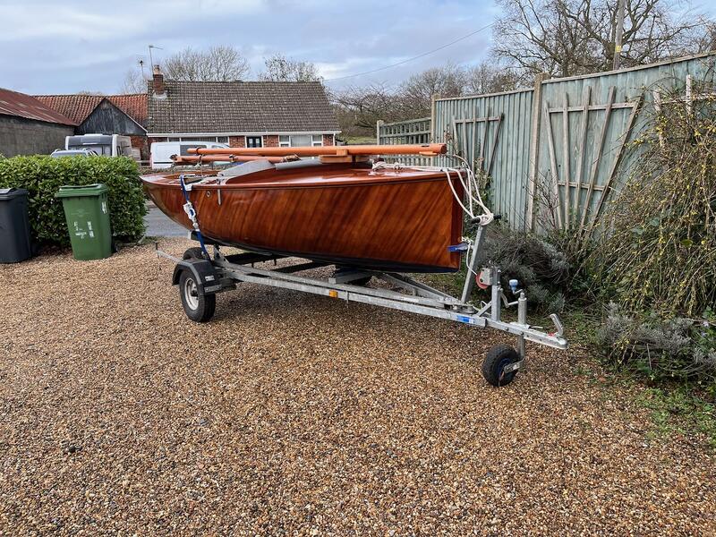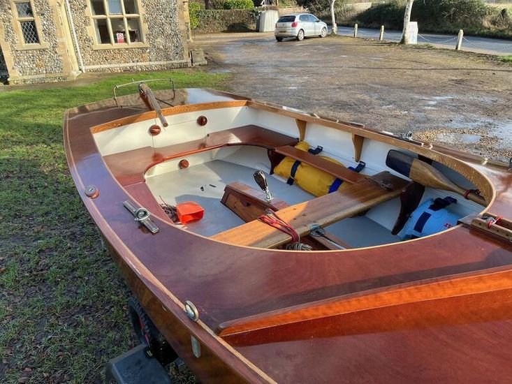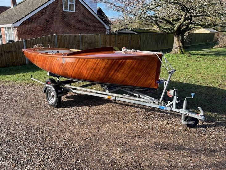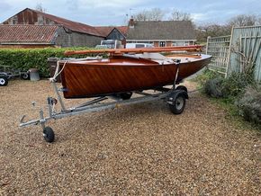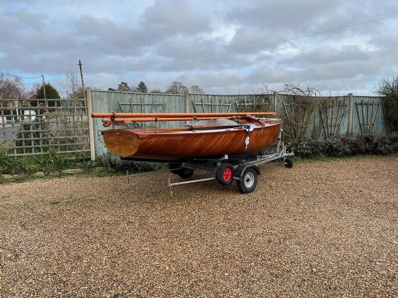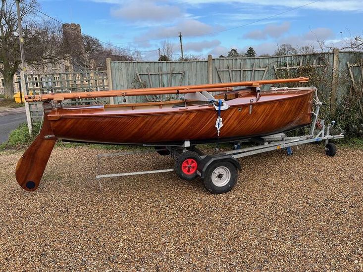 Amateur built over a long period and launched in 2018, Edith G has had relatively light use. She is a Yachting World 14’ Dayboat: a stable, seaworthy classic dinghy well suited to estuary sailing as well as river and lakes. Although a heavy boat for 14’’ she has good performance. The large beam (5’8”), hull form and steel centre plate make it an excellent and safe family dinghy. Some are kept on moorings most are kept on trailers.