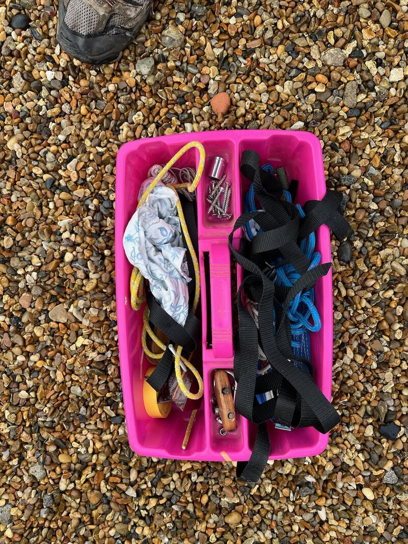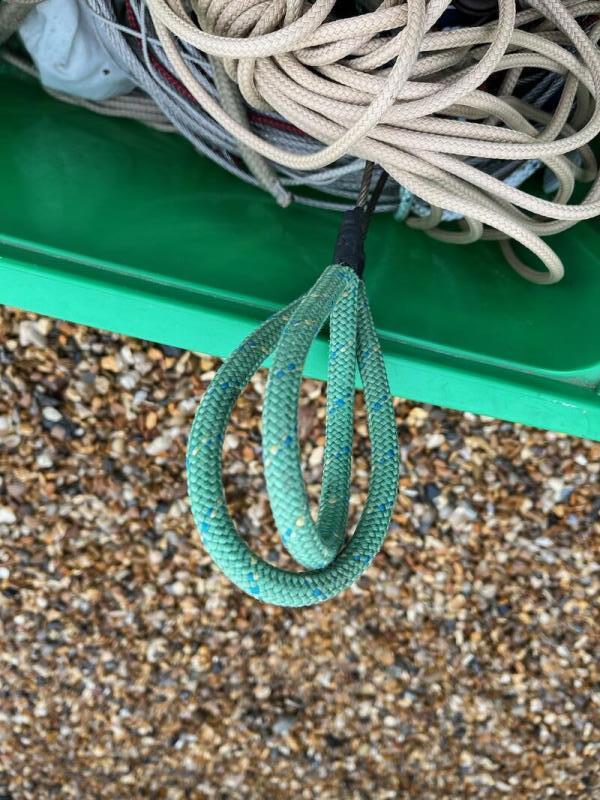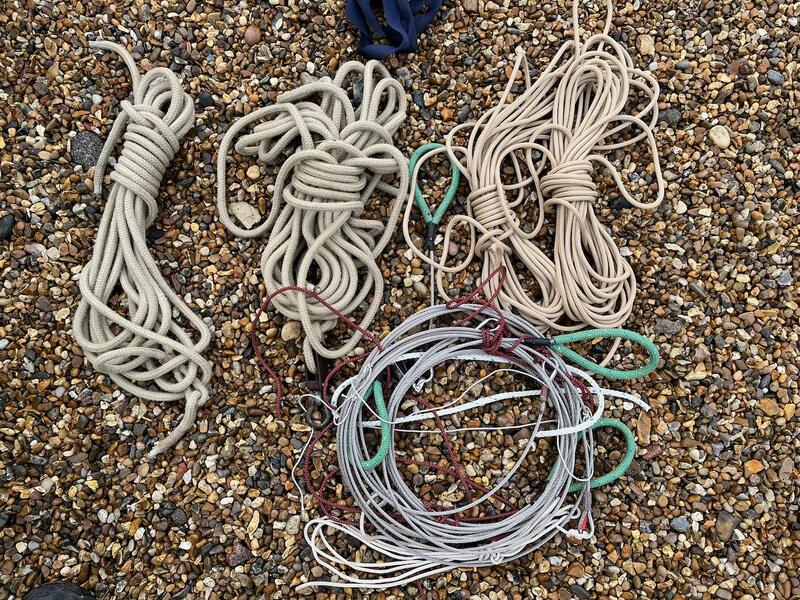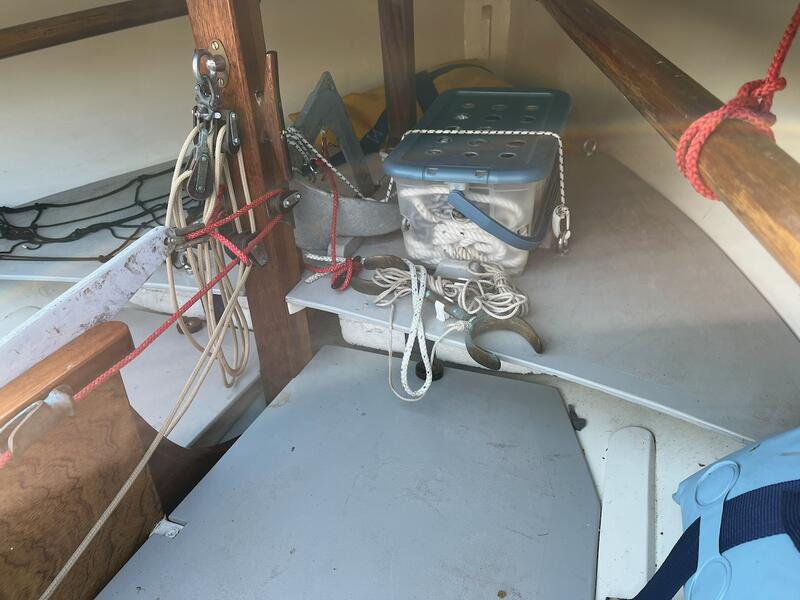 Bruce anchor, 2m chain, rope anchor rode.?Jib-stick, sail ties, burgee, crude winter cover