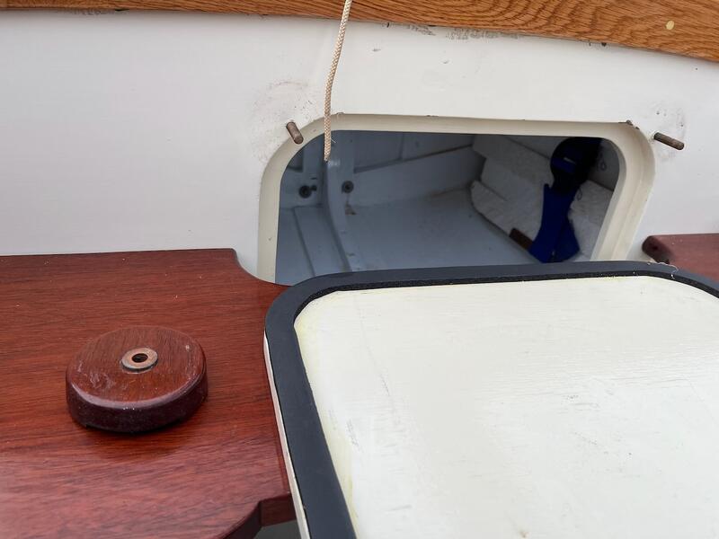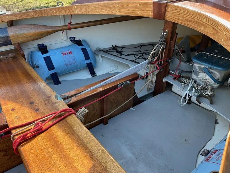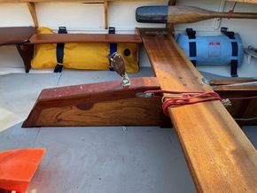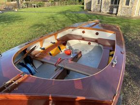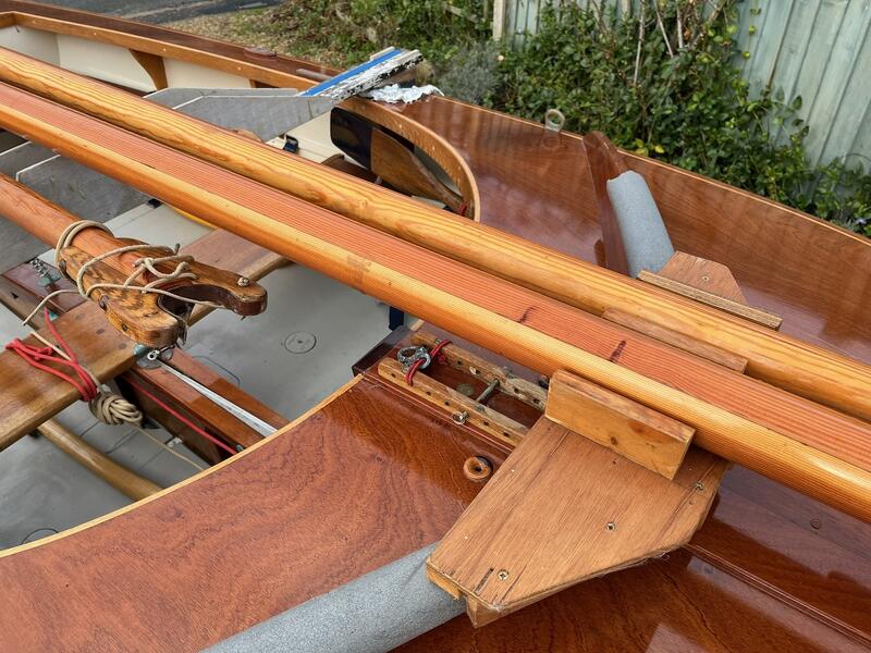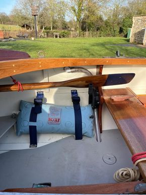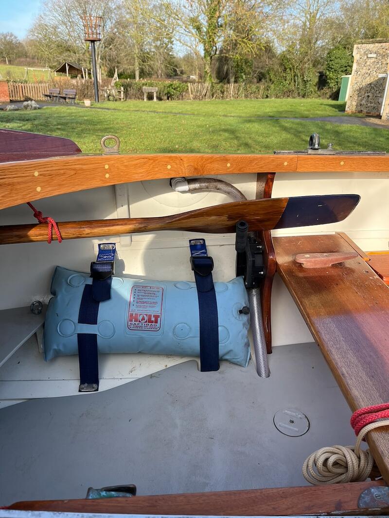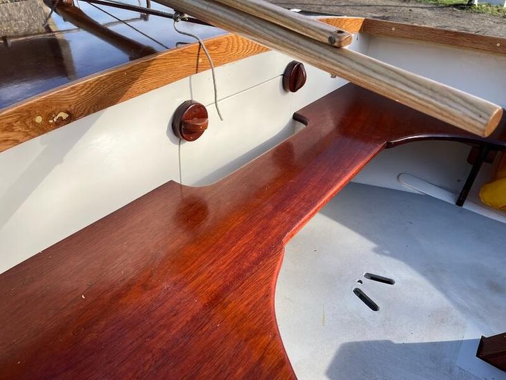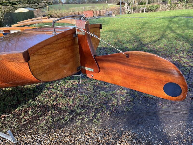 3/8” Mild-steel centre plate, lead-weighted rudder, stowage for anchor, oars, and cruising gear.